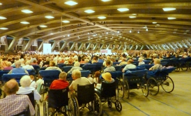 The Accueil Notre-Dame is situated in the Domaine. It is not a hospital in the usual sense but it is where our sick pilgrims are cared for during the week in Lourdes. Literally, it means Our Lady Welcomes, and this is symbolised by the design of the building depicting welcoming open arms. It is situated on the far side of the River Gave near to St Bernadette’s Church.